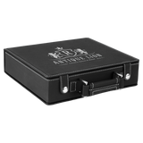 - Leather Covered case measures 8 7/8" X 7 3/4" X 2 1/4"